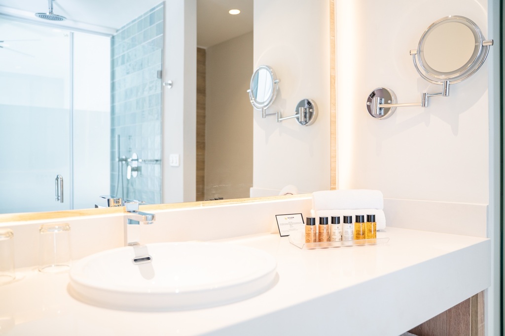 This room type features a King Size bed (2 x 2 m) or two Queen beds (1.50 x 2 m), a separate sofa bed, a bathroom with a rain shower, and a wonderful terrace.