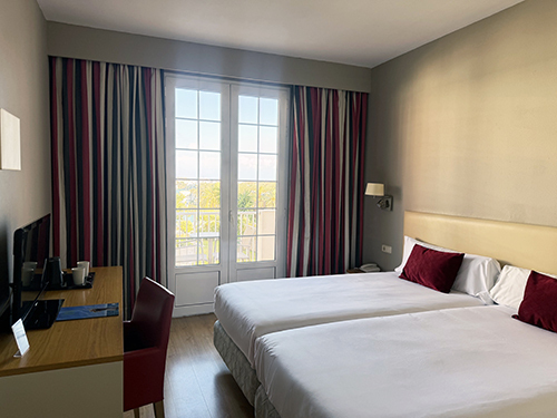 Chambre moderne avec deux lits simples 90 x 2 m et un lit d'appoint, design contemporain et balcon pour profiter de l'air frais.