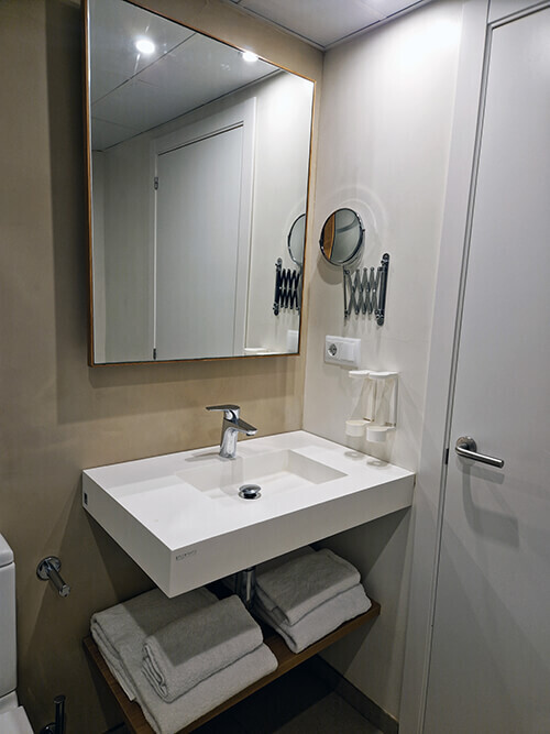 Habitación con cama de 1,50 x 2 m y balcón privado con vistas frontales al mar. Una estancia pensada para disfrutar de la luz natural y de las panorámicas privilegiadas al Puerto de Mahón.